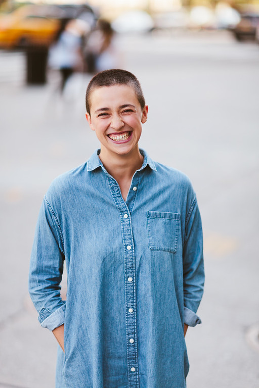 [ IMAGE DESCRIPTION: A vertical portrait depicts Olivia Michiko Gagnon grinning at the camera with enthusiasm. She is centered in the photo, and her head and torso are in frame. She is a mixed-race––white and Japanese-Canadian––settler woman with a buzz cut wearing a big light denim button down shirt with pockets. Her hands rest in her pockets. The background is out of focus, but it appears she is standing on the asphalt of a street in New York. ︎︎ heart symbol ]