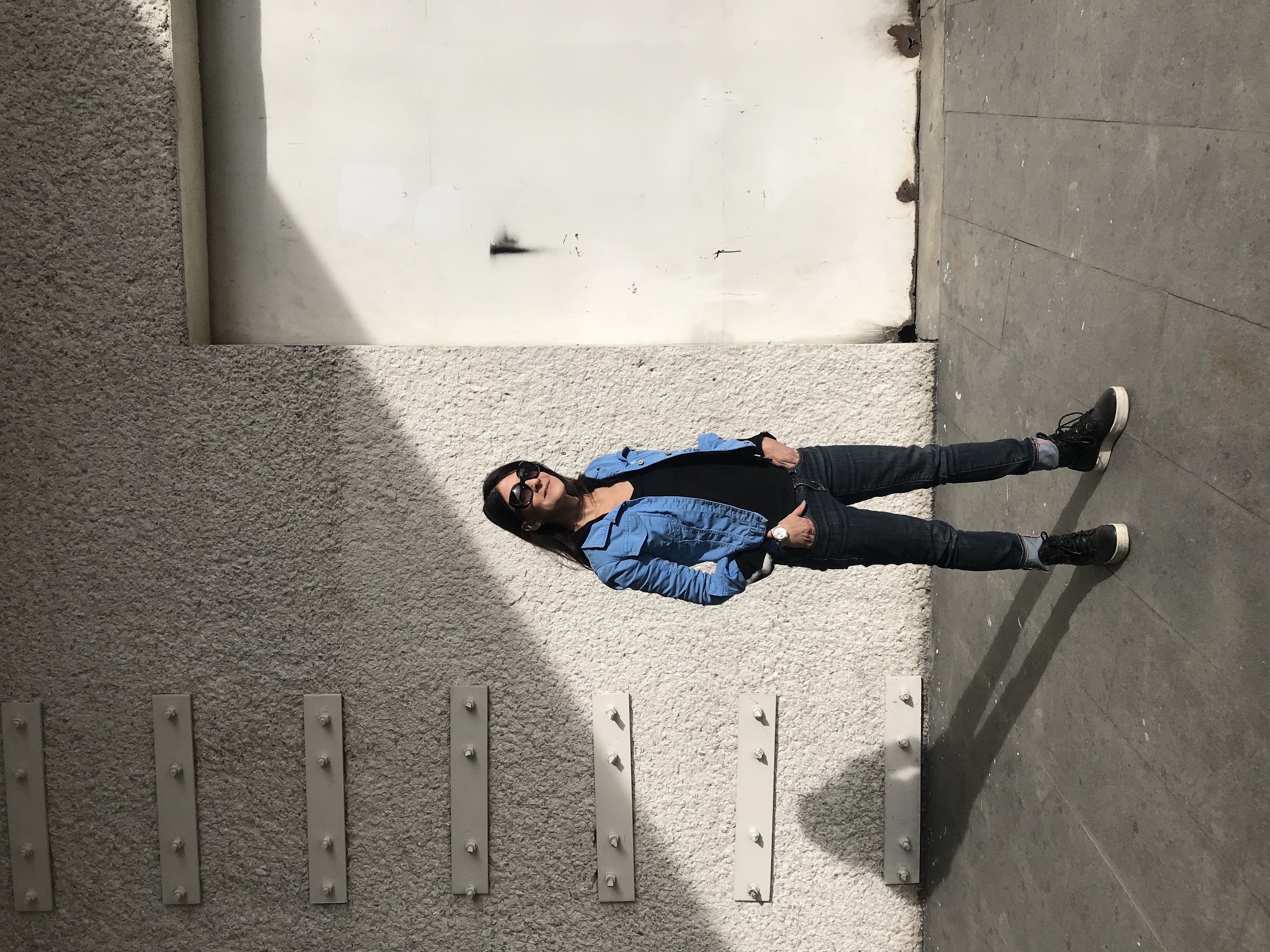 [ IMAGE DESCRIPTION: A photograph of Elena Dorfman. She is a white woman with dark hair who is wearing sunglasses, a black shirt, a blue jacket, jeans, and sneakers. She is standing in front of the exterior wall of a building with her hands in her pockets. The sun is shining on her at an angle, casting her shadow on the ground. There is also a dramatic triangular shadow cast on the wall behind her. The wall is textured and there is an industrial looking door to her right in the image. ︎ heart symbol ]